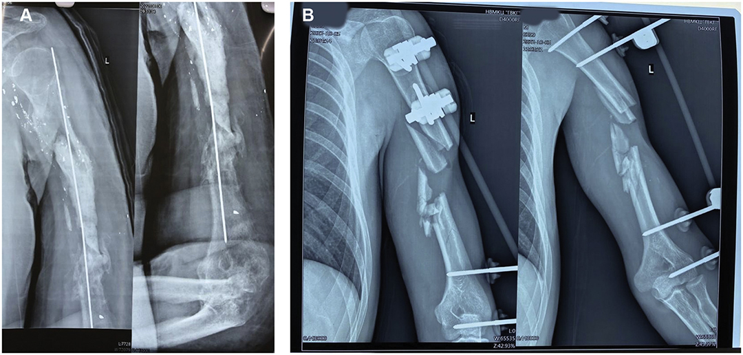 图 2.左肱骨枪伤骨折的 X 射线胶片。左肱骨骨干枪击多碎裂患者,存在骨缺损和碎片移位。B.左肱骨骨干中三分之一处枪伤粉碎性骨折,伴有骨缺损和碎片移位。