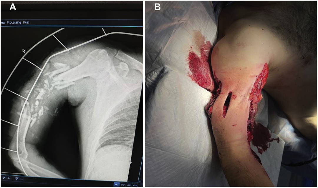 图 1.右肱骨多碎裂患者的照片,存在骨缺损和碎片移位。伴有骨缺损和碎片移位。A.显示严重骨折的X光片;B.术前照片