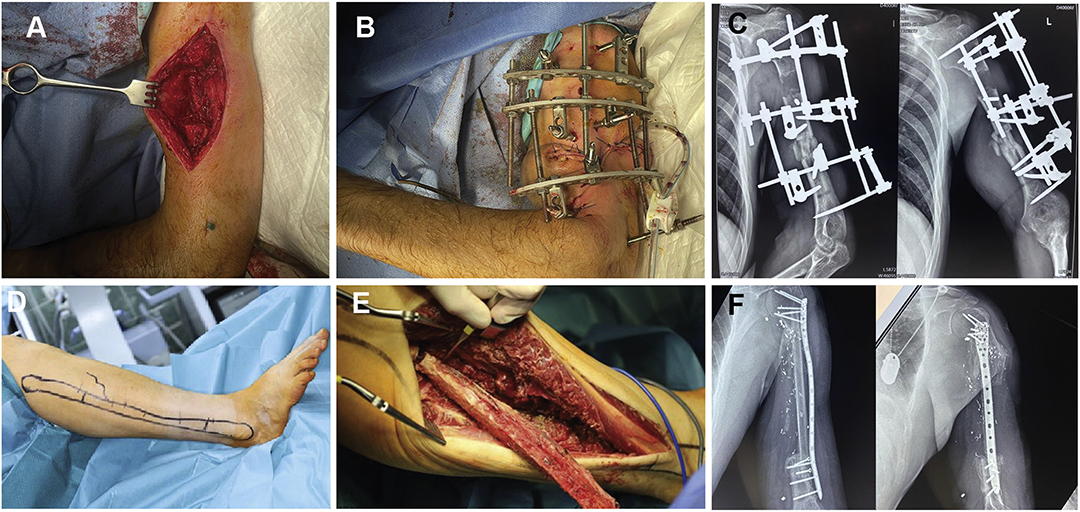 图6:患者的临床照片,显示了闭合复位、经皮拉力螺钉和Ilizarov骨外固定(A、B、C)以及血管蒂移植物上腓骨(D、E、F)的治疗阶段。