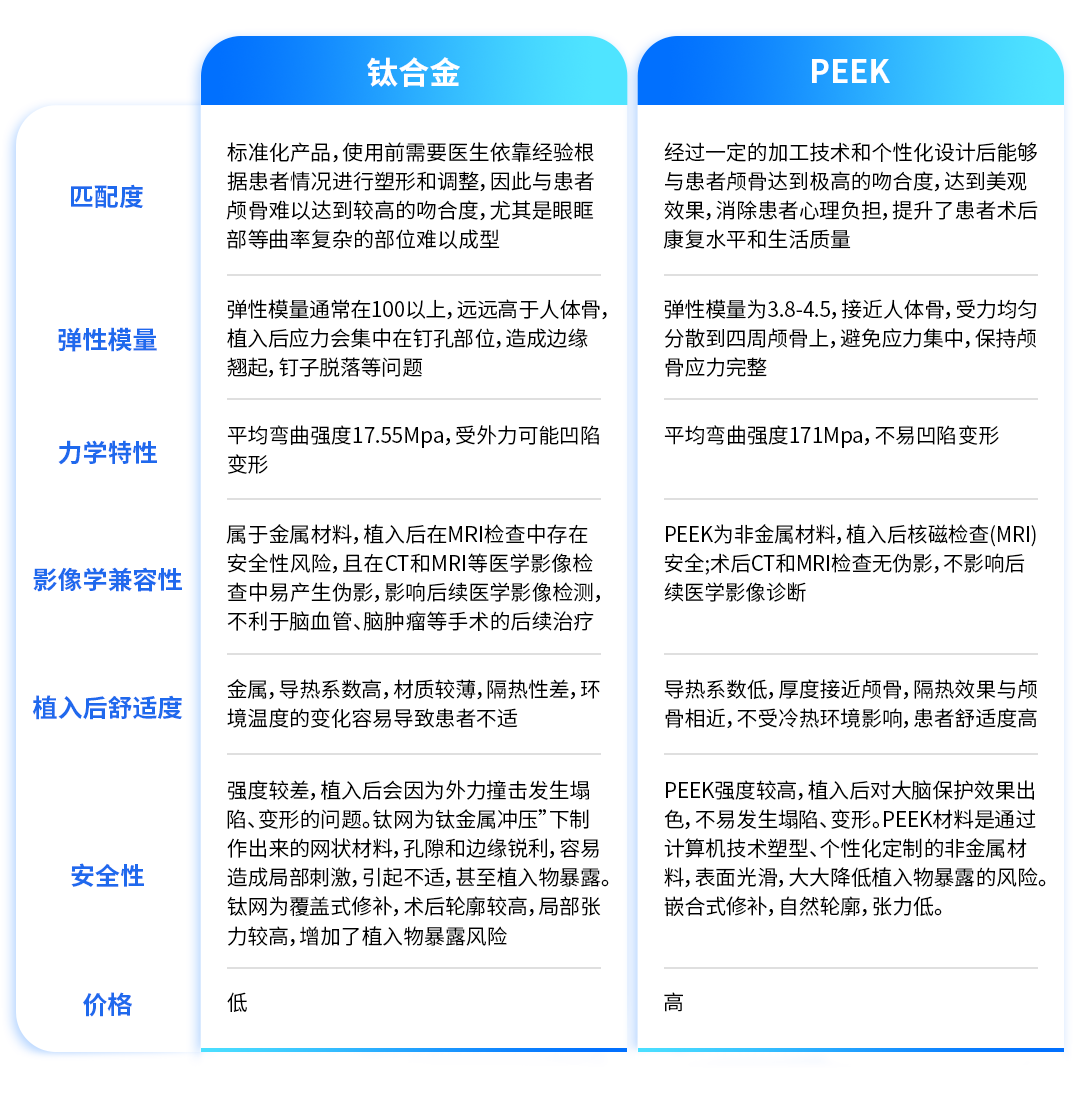 颅骨修复:PEEK颅骨修复网板具有生物相容性好、导热系数低、力学性能稳定、术后检查无伪影等优点,采用3D打印技术成型,嵌入紧密,外观完美。甘肃中医院神经外科杨有文主任介绍,PEEK消除了传统材料的诸多弊端,避免了温差带来的不适,正成为颅骨修复手术的首选材料。